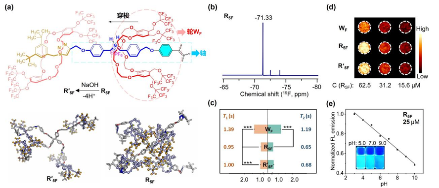 轮烷氢键断裂导致的构象变化(a);R5F19F NMR(b);轮WF、轮烷R5FR’5F19F弛豫时间(T1T2,c)和对应19F MRI(d);R5FpH响应FLI(e